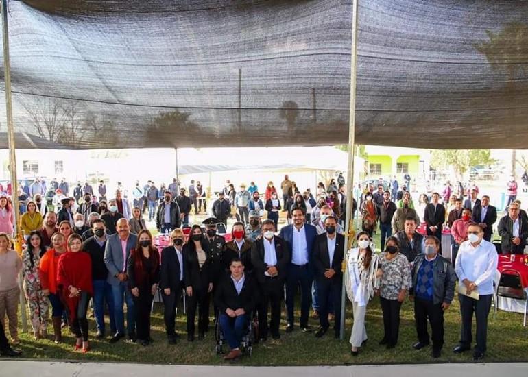 Acompañando al Presidente Carlos Peña, el Presidente del Patronato del Sistema DIF, Carlos Peña Garza; la Alcaldesa de Díaz Ordaz, Nataly García Díaz; el Senador, Faustino López Vargas; funcionarios municipales, integrantes del Cabildo, autoridades militares y familias descendientes de los fundadores.