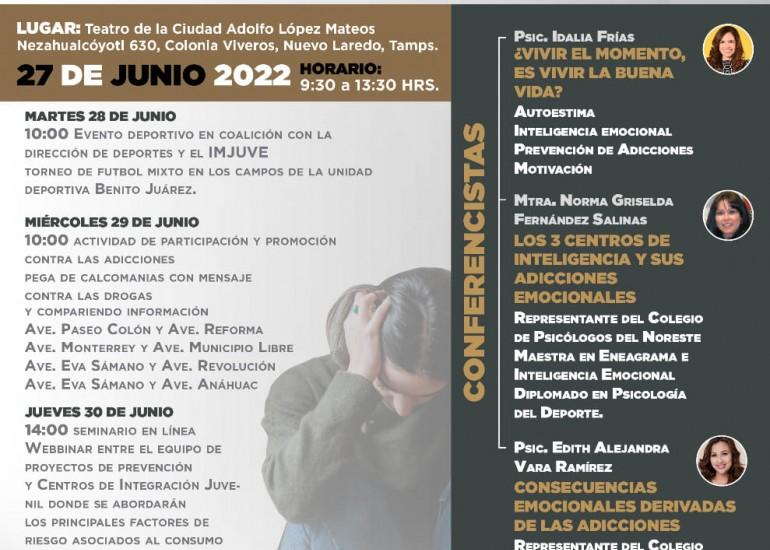 El arranque será el lunes 27 de junio en el teatro de la ciudad Adolfo López Mateos de 9:30 de la mañana a 1:30 de la tarde, con las conferencias ¿Vivir el momento, es vivir la buena vida?, Los 3 Centros de Inteligencia y sus Adicciones Emocionales, además Consecuencias Emocionales Derivadas de las Adicciones.
