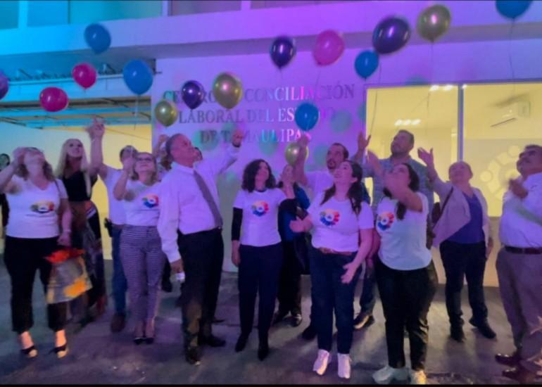 Finalmente, la fachada del Centro de Conciliación Laboral de Tamaulipas, fue iluminada con esos tres colores y se soltaron globos al cielo, en señal de solidaridad con las personas que padecen alguna de las enfermedades raras.
