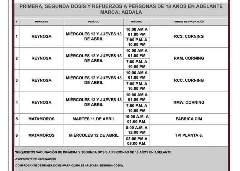 La calendarización de esta semana para la aplicación de la vacuna contra el Covid dará inicio hoy martes 11, miércoles 12 y jueves 13 de abril en el Municipio de Matamoros en la fábrica #CIM #TPI planta 6, de 10:00 a 13:00 horas.