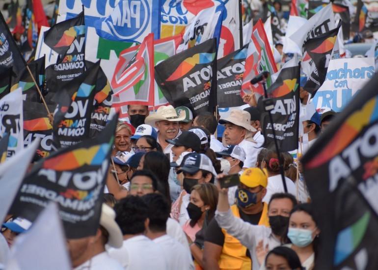A lo largo del camino, y en medio del coro “Gobernador, Gobernador, Gobernador”, al candidato se le fueron uniendo grandes contingentes portando banderines de los tres partidos que conforman la coalición Va por Tamaulipas, PAN, PRI y PRD, cuyos militantes participaron también de esta fiesta.