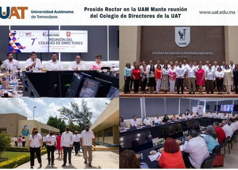 El Rector de la Universidad Autónoma de Tamaulipas (UAT), C.P. Guillermo Mendoza Cavazos, presidió la séptima reunión del Colegio de Directores que tuvo como sede a la Unidad Académica Multidisciplinaria Mante Centro (UAM-Mante), en cuyo marco dio a conocer los avances del cumplimiento a los proyectos estratégicos de la máxima casa de estudios en el estado.