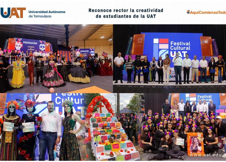 En el marco de la clausura del Festival Cultural Universitario, que se realizó en el Campus Victoria, el C. P. Guillermo Mendoza Cavazos, rector de la Universidad Autónoma de Tamaulipas (UAT), reconoció el talento y la creatividad de los estudiantes que participaron en los concursos organizados con motivo del Día de Muertos.