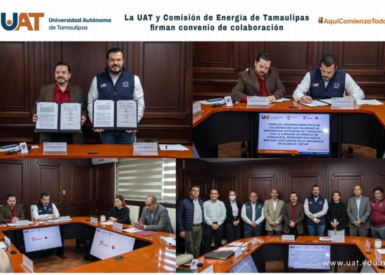 Ciudad Victoria, Tam.- La Universidad Autónoma de Tamaulipas (UAT) y la Comisión de Energía de Tamaulipas (CETAM) celebraron la firma de un convenio de colaboración específica en el que unen esfuerzos para aprovechar el potencial energético de la entidad, mediante el desarrollo de investigación, tecnologías y conocimientos que contribuyan en aportar beneficios directos a la sociedad.
