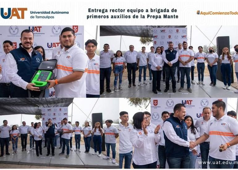 El C. P. Guillermo Mendoza Cavazos, rector de la Universidad Autónoma de Tamaulipas (UAT), entregó un equipo de reanimación cardiopulmonar (RCP) a jóvenes integrantes de la Brigada de Primeros Auxilios de la Escuela Preparatoria Mante.