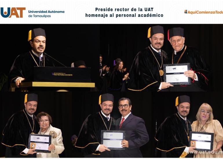 El rector de la Universidad Autónoma de Tamaulipas (UAT), Guillermo Mendoza Cavazos, presidió en esta capital la ceremonia de Reconocimiento a la Trayectoria Docente, en cuyo marco entregó diplomas, estímulos económicos y medallas conmemorativas al personal académico de las zonas norte y centro del estado por su labor al servicio de la casa de estudios.