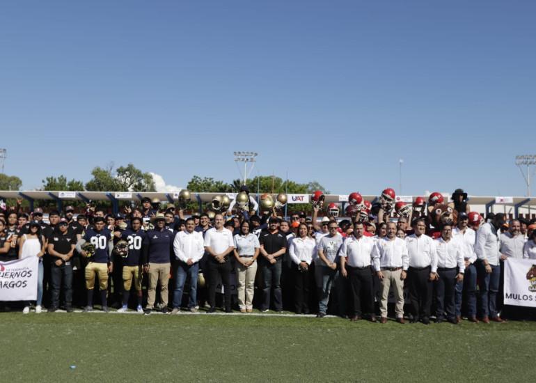 El rector Guillermo Mendoza dio la patada inicial del torneo de futbol americano en el que participan ocho equipos de las diferentes facultades de la UAT e instituciones invitadas.El Rector de la Universidad Autónoma de Tamaulipas (UAT), C.P. Guillermo Mendoza Cavazos, inauguró la Temporada 2023 de la Liga Universitaria de Fútbol Americano (LUFA UAT) Categoría Novatos, en el escenario del Estadio Olímpico Eugenio Alvizo Porras del Centro Universitario Victoria.