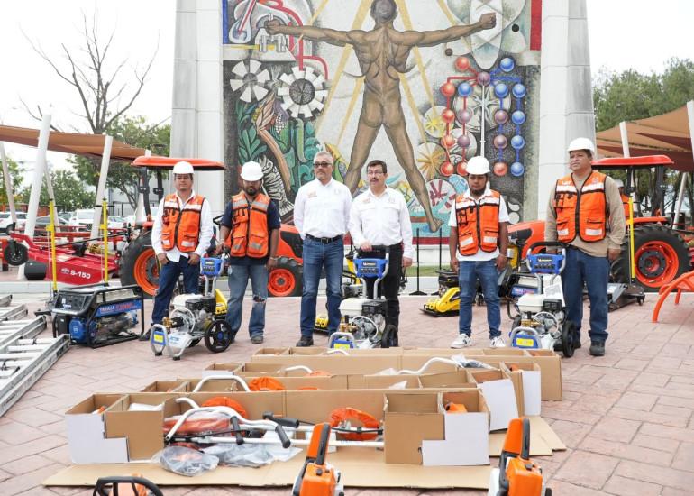 En la ceremonia realizada en el Centro Universitario Victoria, se dotó de nuevo equipo y herramientas consistentes en hidrolavadoras, escaleras, motosierras, compactadoras, cortadoras de piso, tractores, generadores eléctricos y gatos hidráulicos, entre otras.