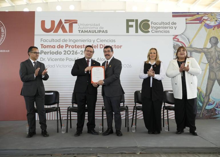 En una gira de trabajo por la Facultad de Ingeniería y Ciencias (FIC), el rector de la Universidad Autónoma de Tamaulipas (UAT), Dámaso Anaya Alvarado, inauguró la techumbre de la cancha de usos múltiples; a la vez que oficializó el inicio de la gestión del Dr. Vicente Paul Saldívar Alonso como director del plantel para el periodo 2026-2029.