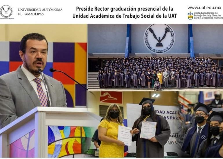 De la Licenciatura en Psicología, Yuliana Fernanda Rocha Zúñiga; de Nutrición, Ayde Karime Ramos Zavala; y de Trabajo Social, Reyna Blanca Guadalupe Martínez Palomares, quien además recibió la medalla al mérito y la presea “Mtra. Myrna Maribel Medrano Vargas” por contar con un promedio excelente.Fue Reyna Martínez Palomares quien, a nombre de sus compañeros de generación, emitió el mensaje de despedida, en el que agradeció a quienes les dieron su apoyo a lo largo de la carrera.Cabe señalar que esta graduación es la primera que se realiza de forma presencial en esta sede de la UAT desde el inicio de la contingencia por COVID-19.