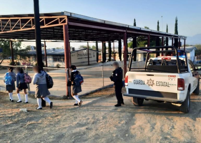 A través del operativo “Escuela Segura”, personal de la Guardia Estatal salvaguarda la integridad de los estudiantes de todos los niveles, mediante recorridos de seguridad y vigilancia.