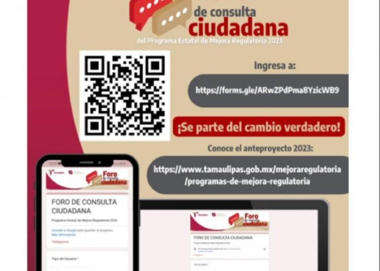 El programa de Mejora Regulatoria 2023, se encuentra en fase de anteproyecto en donde a través del foro, los ciudadanos pueden conocer las propuestas en materia regulatoria que tienen las dependencias, entidades y municipios que integran el gobierno de Tamaulipas que encabeza Américo Villarreal Anaya, el cual ha dispuesto mantener una estrecha relación con la población con consultas incluyentes que definen la transformación de nuestro estado.