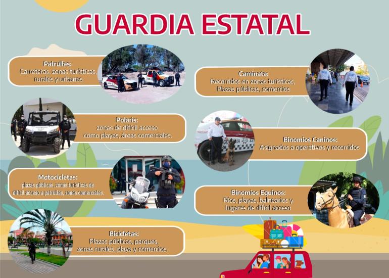 La Guardia Estatal tiene desplegados casi tres mil elementos en todo el estado, principalmente en las carreteras que conducen a los sitios turísticos más visitados, como son las playas, ríos, balnearios y Pueblos Mágicos, entre otros.