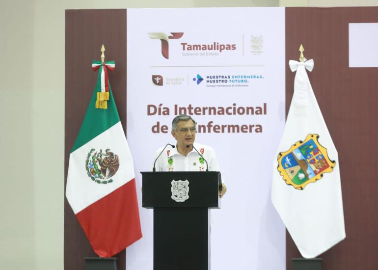 En el marco del Día Internacional de la Enfermería y durante un evento realizado en el Polyforum Victoria, acompañado de la presidenta del DIF Tamaulipas, María Santiago de Villarreal y del secretario de Salud, Vicente Joel Hernández Navarro, dijo que la enfermería en Tamaulipas tendrá el lugar que le corresponde, ya que es una profesión más en el ámbito de la salud.