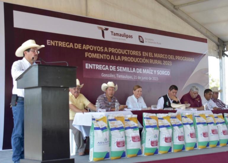 González, Tamaulipas.- Con la intención de seguir impulsando la actividad agrícola y mejorar el nivel de ingresos de los pequeños productores y productoras de la zona sur del estado, el secretario de Desarrollo Rural, Dámaso Anaya Alvarado llevó a cabo la entrega de semilla de sorgo y maíz como parte del programa Fomento a la Producción Rural 2023.