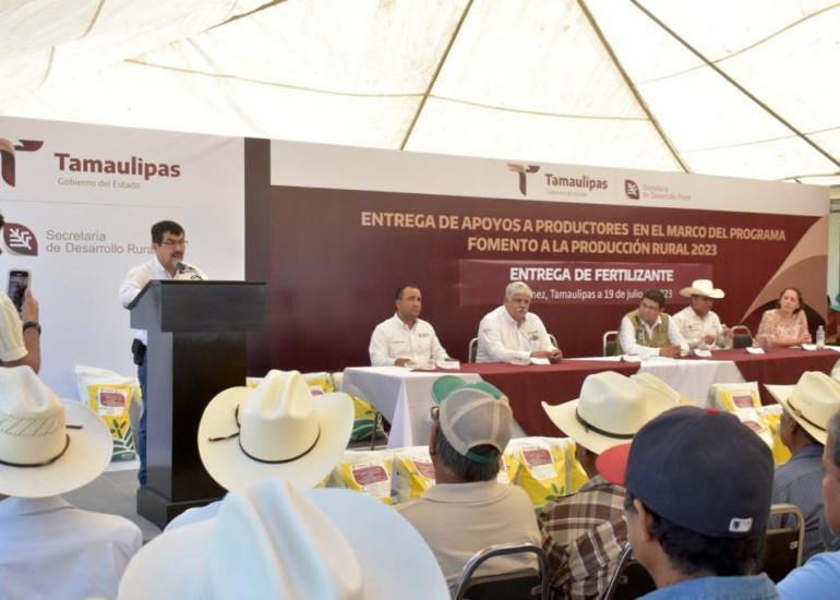Güémez, Tamaulipas. – Con la firme intención de elevar la productividad y garantizar la autosuficiencia alimentaria, la Secretaría de Desarrollo Rural llevó a cabo la entrega de cerca de 76 toneladas de fertilizante a productores citrícolas en los municipios de Güémez e Hidalgo, esto como parte del programa Fomento a la Producción Rural 2023.