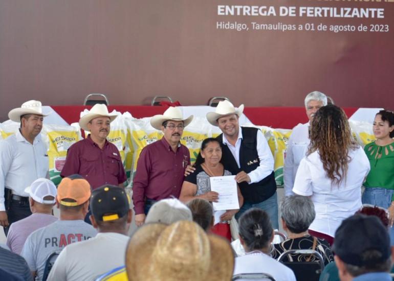 Hidalgo, Tamaulipas.- Un total de 50 toneladas de fertilizante de la variedad MAP fueron entregadas a productores citrícolas de los municipios de Hidalgo y Villagrán, esto como parte del compromiso que tiene el gobernador Américo Villarreal Anaya con los agricultores de fortalecer la actividad citrícola del estado.