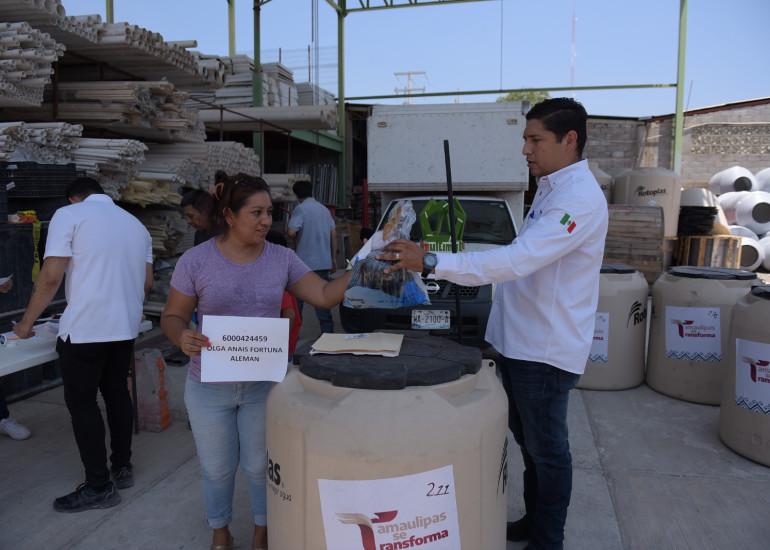 Para apoyar a las familias con recipientes seguros que les permitan almacenar agua, el Gobierno de Tamaulipas ha entregado esta semana 320 tinacos, en diferentes colonias de la capital.