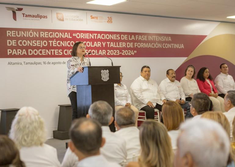 En el marco del inicio del ciclo escolar 2023-2024 en Tamaulipas, la Secretaría de Educación en la entidad, realizó las Reuniones Regionales “Orientaciones de la Fase Intensiva de Consejo Técnico Escolar y Taller de Formación Continua para Docentes”, dirigido a jefas y jefes de sector, supervisoras y supervisores escolares, coordinadoras y coordinadores de sede de inglés y a centros de maestros de nivel de educación básica, presididas por la titular de la SET, Lucía Aimé Castillo Pastor.