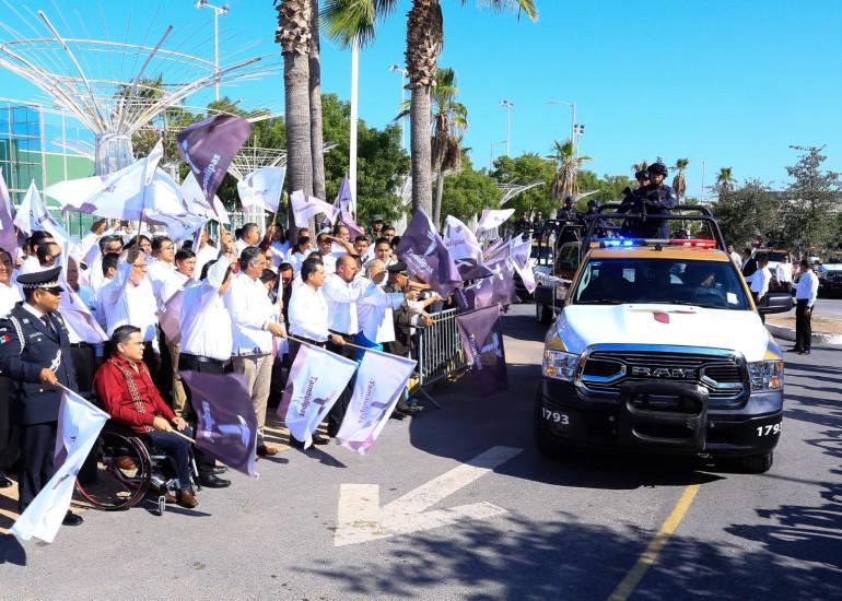 Luego de presidir la ceremonia cívica de honores, en la Unidad Deportiva Adolfo Ruiz Cortines, el gobernador acompañado por el secretario de Seguridad Pública y representantes de las Fuerzas Armadas, se trasladó a la explanada del complejo deportivo en donde dio el banderazo de salida a las cien nuevas patrullas.