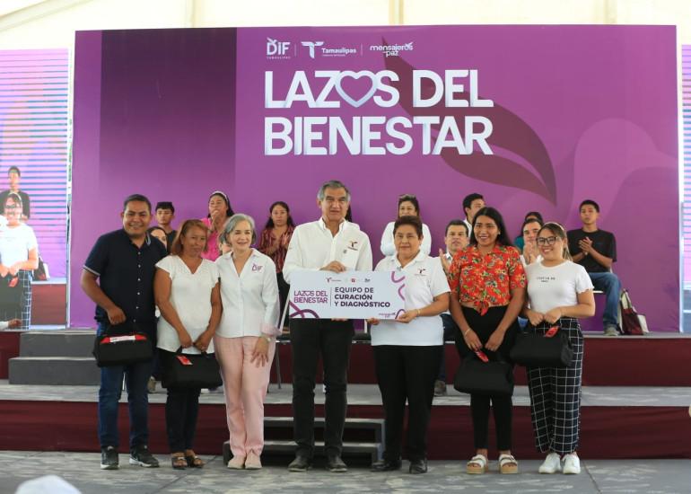 Luego de ser recibido entusiastamente, el gobernador y la presidenta del DIF Tamaulipas hicieron entrega de módulos para alfabetización y conclusión de primaria y secundaria que incluye mochilas y útiles escolares, así como equipo de curación y diagnóstico para la red de enfermeras y enfermeros de este polígono, además de apoyos para la conformación de cooperativas de mujeres, para jóvenes del grupo “Estefanía Castañeda” y del programa de estímulo de “Juntos Cuidamos”.