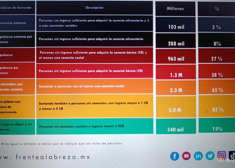 Esta demarcación de 3.6 millones de habitantes, 288 mil viven en pobreza extrema por ingresos (8%), esto significa que con su ingreso no les alcanza para adquirir la canasta alimentaria. En pobreza por ingresos están 1.3 millones de personas (38% de la población), su ingreso no cubre el costo de la canasta básica.