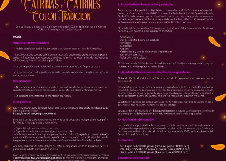 En este sentido, el ITCA invita a la comunidad tamaulipeca a participar en el concurso de altares, comparsas, catrinas y catrines que se llevará a cabo el día 2 de noviembre de 2023 en la explanada del Centro Cultural Tamaulipas en Ciudad Victoria.
