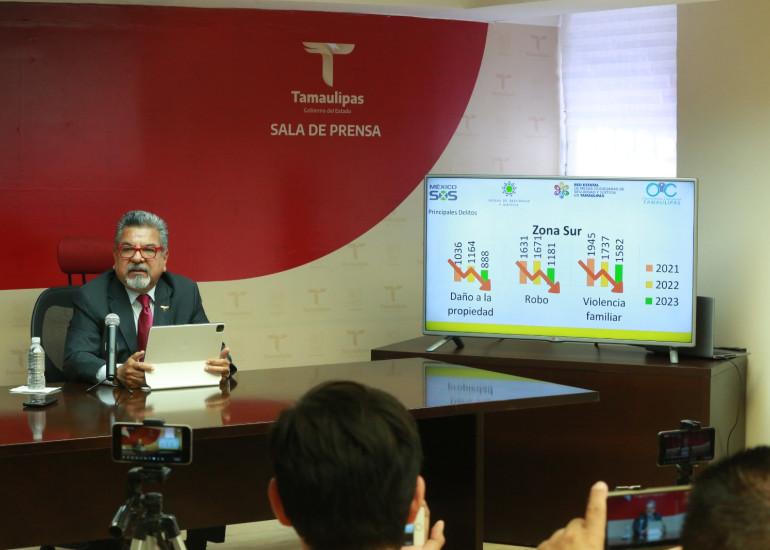 La Vocería de Seguridad de Tamaulipas afirmó que sigue a la baja la incidencia delictiva en el estado, lo cual se demostró con un estudio realizado por la Red Estatal de Mesas Ciudadanas de Seguridad y Justicia, a través del Observatorio Ciudadano para conocer los principales delitos en los municipios de Tamaulipas en el 2023 y compararlo con los dos años inmediatos anteriores.