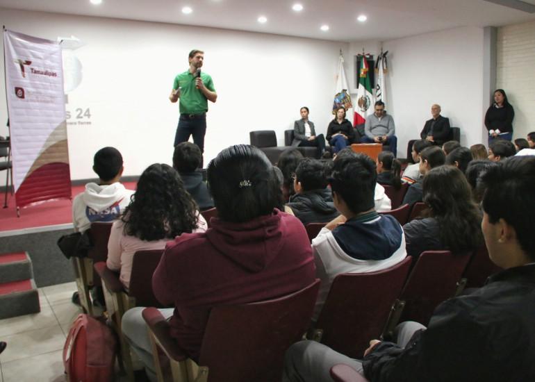 En una plática con alumnos del Centro de Bachillerato Tecnológico, Industrial y de Servicios (CBTis 24) en representación de la titular de la SEDUMA, Karina Lizeth Saldívar Lartigue, el subsecretario de Medio Ambiente, Karl Heinz Becker Hernández, consideró importante que las nuevas generaciones asuman su compromiso en el cuidado del entorno natural, como lo impulsa el gobernador, Américo Villarreal Anaya.