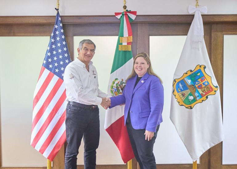 El gobernador Américo Villarreal Anaya y la cónsul de Estados Unidos en Matamoros, Brianna Powers, sostuvieron este miércoles una reunión donde acordaron trabajar y colaborar en armonía para que le vaya bien a Tamaulipas y al vecino país.