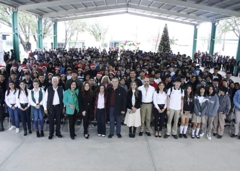 La secretaria del Trabajo y Previsión Social del gobierno de Américo Villarreal Anaya en el Conalep plantel Victoria, hizo un recuento de los logros en materia del trabajo durante 2023, y el impulso en el proceso de vinculación al mercado laboral con las instituciones educativas.