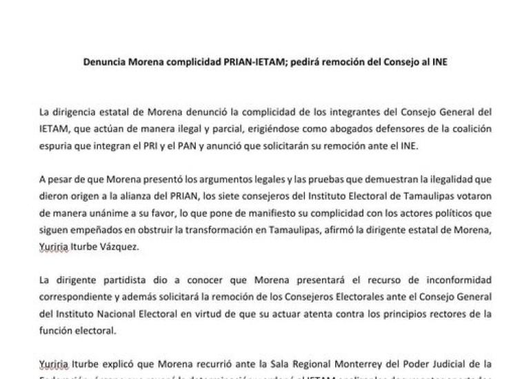 La dirigencia estatal de Morena denunció la complicidad de los integrantes del Consejo General del IETAM, que actúan de manera ilegal y parcial, erigiéndose como abogados defensores de la coalición espuria que integran el PRI y el PAN y anunció que solicitarán su remoción ante el INE.