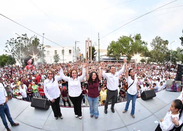 "Para seguir construyendo uno de los mejores capítulos de la historia, vamos a representarlos desde el Senado de la República, respaldaremos la beca universal para educación básica, que no haya ni una niña, niño o adolescente que deje de estudiar por falta de recursos; respaldaremos la propuesta de la doctora de apoyar a las mujeres de 60 a 64 años; respaldaremos el plan nacional hídrico, la seguridad pública y aumentar el salario mínimo y el salario de las maestras y los maestros... nosotros pensamos en derechos, no en privilegios".
