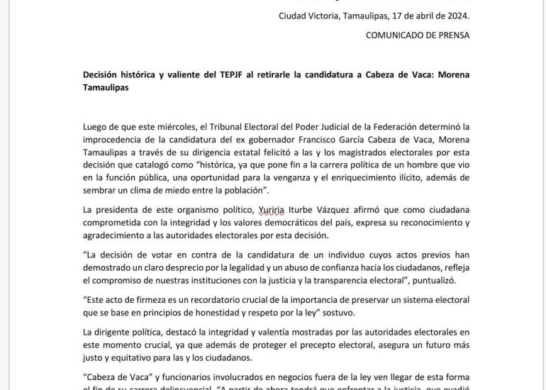 Morena Tamaulipas a través de su dirigencia estatal felicitó a las y los magistrados electorales por esta decisión que catalogó como “histórica, ya que pone fin a la carrera política de un hombre que vio en la función pública, una oportunidad para la venganza y el enriquecimiento ilícito, además de sembrar un clima de miedo entre la población”.