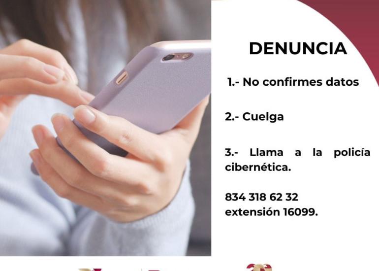 Ante ello, se recomienda evitar confirmar datos, no corregir información y colgar. El extorsionador siempre tendrá tiempo para volver a marcar. Si lo vuelve a hacer, obtenga de él la mayor información posible y denuncie a la policía cibernética al 834 318 62 32, extensión 16099.