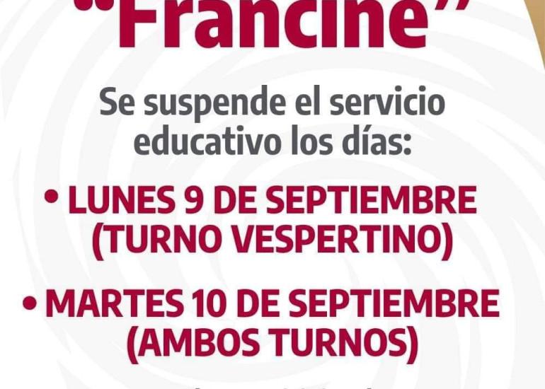 Con motivo de la cercanía de la tormenta tropical Francine a las costas tamaulipecas, la Secretaría de Educación de Tamaulipas (SET) informa la suspensión de actividades escolares este lunes 9 y martes 10 de septiembre en los municipios de Matamoros, San Fernando y Valle Hermoso.