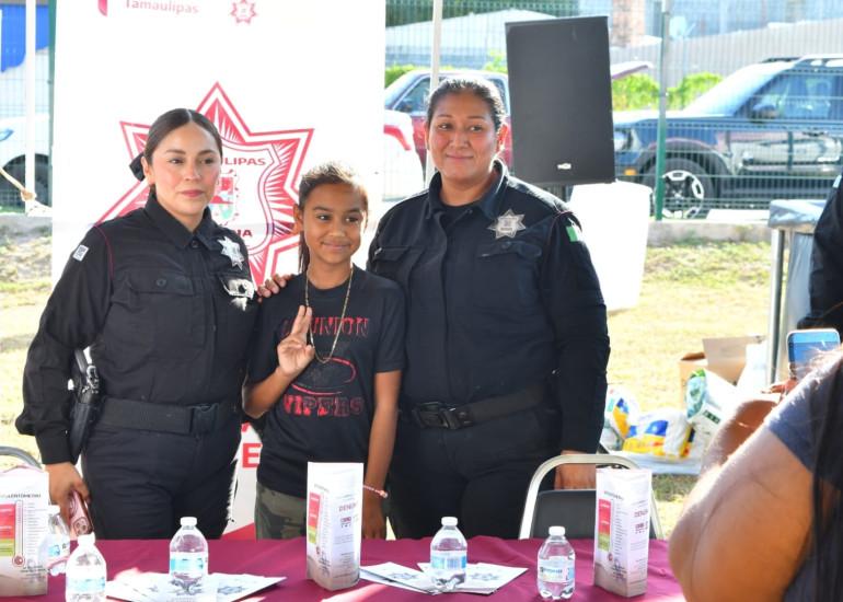 Camargo, Tamaulipas. - A través de las unidades de la Guardia Estatal de Género, Cibernética y el área de reclutamiento, la Secretaría de Seguridad Pública de Tamaulipas (SSPT) mantiene la proximidad con la ciudadanía asistente a la brigada ‘’Transformando Familias’’ celebrada en el municipio de Camargo.