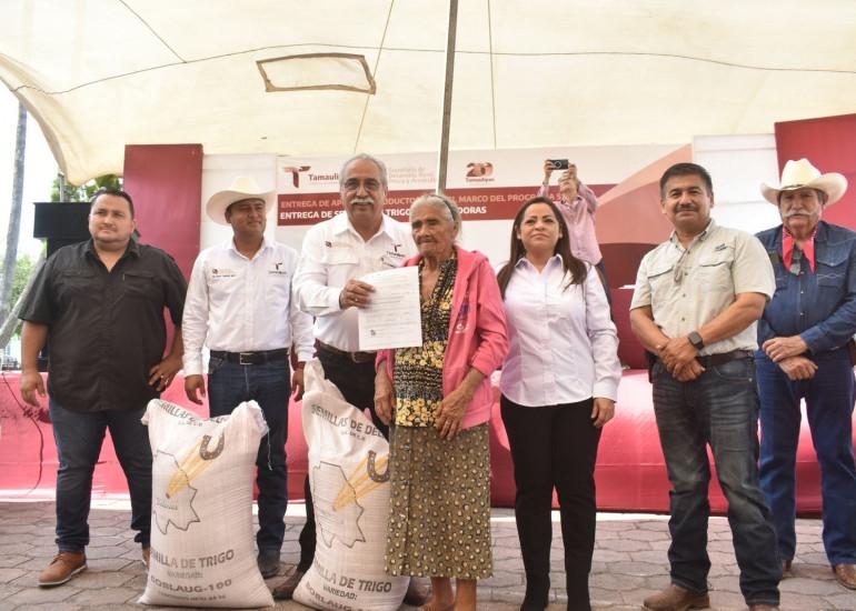 Por su parte, Eliseo Camacho Nieto, subsecretario de Desarrollo Agrícola refirió que "desde la administración del gobernador Américo Villarreal Anaya, hemos estado juntos en esta lucha y ante esta problemática, hoy estamos aquí con ustedes para hacer entrega de semilla de trigo y de sembradoras, decirles que con esta semilla iniciamos el plan piloto en la búsqueda de alternativas que suplan el plantío de sorgo, sabemos de la importancia de la región como lo es el grano rojo".