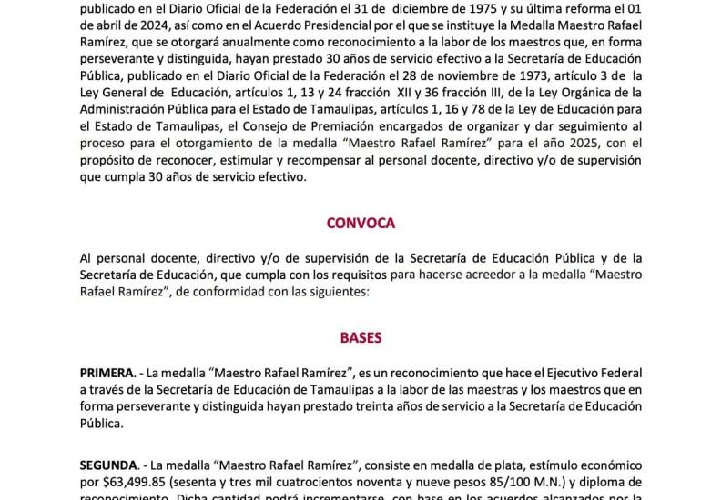 Como un justo reconocimiento a su compromiso y dedicación en beneficio de las niñas, niños adolescentes y jóvenes, la Secretaría de Educación Pública (SEP) y la Secretaría de Educación de Tamaulipas (SET), lanzaron la convocatoria a la Medalla “Maestro Rafael Ramírez” 2025.