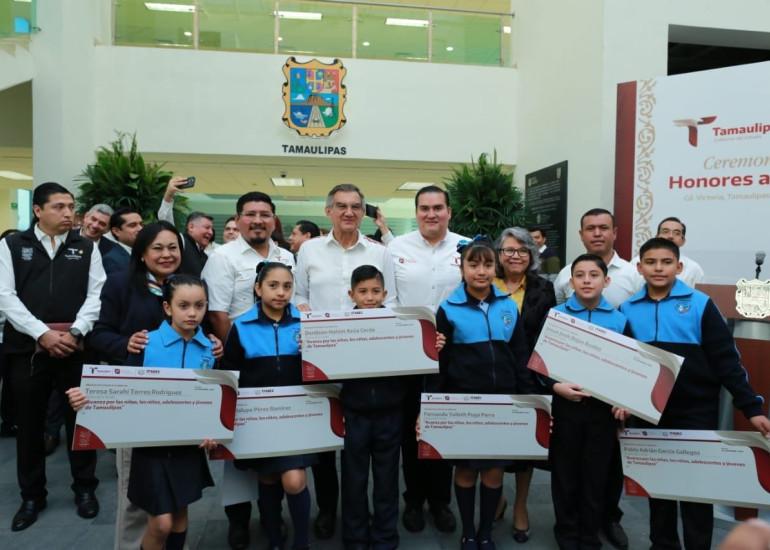Al presidir la ceremonia cívica de honores en el Congreso del Estado, el gobernador también entregó de manera simbólica las Becas Avanza por las Niñas, los Niños, Adolescentes y Jóvenes de Tamaulipas, que en todo el estado benefician a un total de 28,883 alumnos y alumnas de primaria y secundaria por un monto de 72 millones 207 mil 500 pesos.