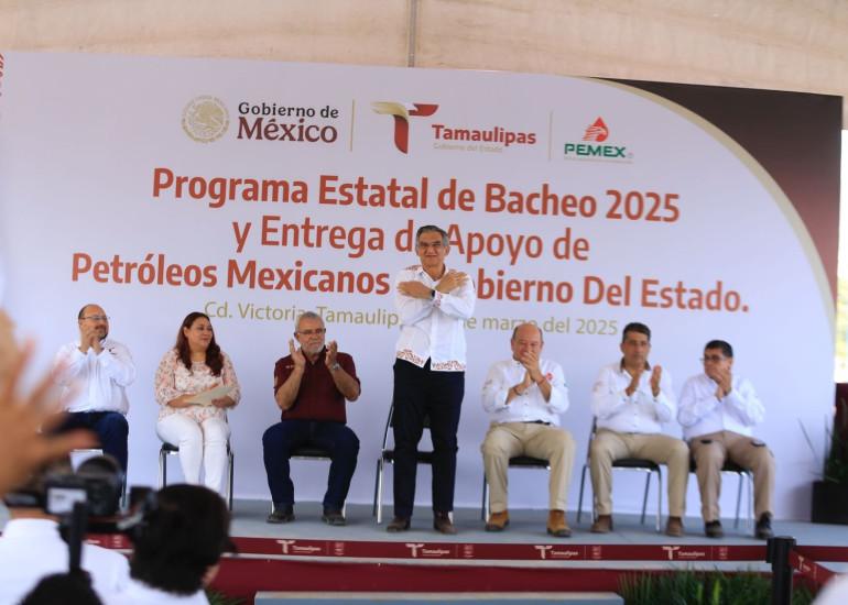 En el evento, César Raúl Ojeda Zubieta, gerente de Responsabilidad Social de PEMEX, entregó al gobernador una ambulancia de traslado equipada, un camión tipo grúa con canastilla y dos camiones recolectores y compactadores de basura; además, anunció que Petróleos Mexicanos donará cinco mil toneladas de asfalto para que sigan pavimentándose las calles de Tamaulipas.