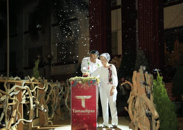 En medio de una gran fiesta que culminó con el encendido del monumental pino navideño, el gobernador Américo Villarreal Anaya, junto a la presidenta del DIF Estatal, doctora María de Villarreal, deseó a las familias tamaulipecas que esta sea la mejor de las celebraciones y estén llenas de paz, reflexión y una visión humanista para poder seguir avanzando y progresando con bienestar.