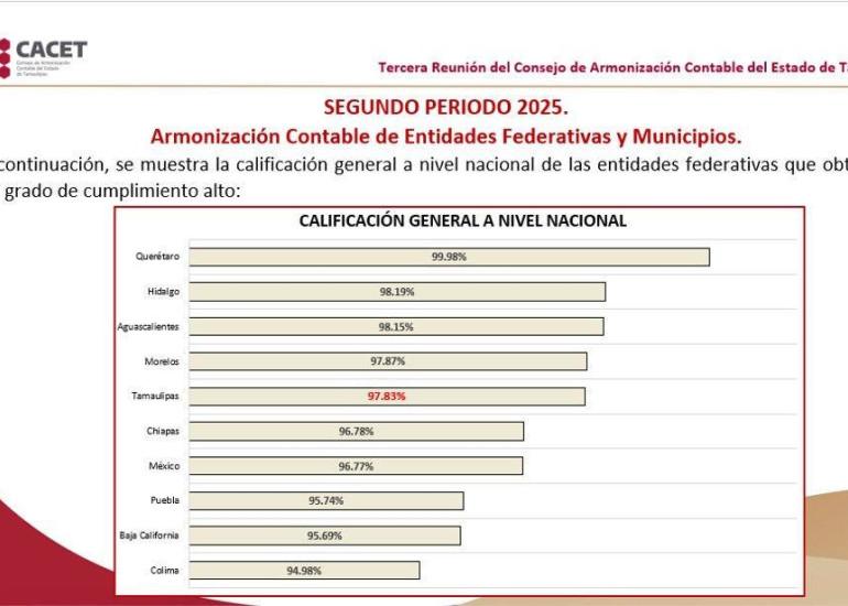 Durante la sesión se informó que Tamaulipas alcanzó un resultado nacional de 97.83%, lo que ubica al estado en un nivel de cumplimiento alto y dentro de los primeros cinco lugares del país. Este logro refleja el compromiso de las instituciones públicas tamaulipecas con la correcta aplicación de las normas contables y la transparencia en el manejo de los recursos.