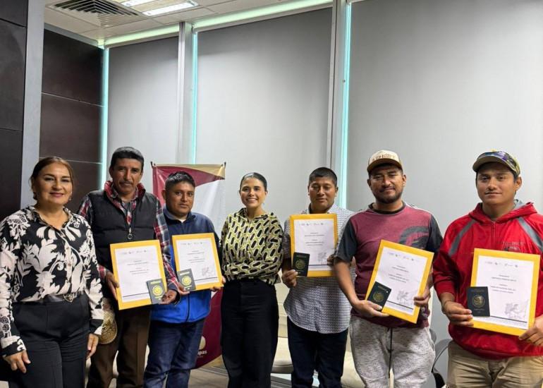 En esta ocasión, se realizó la entrega de sobres de viaje a cinco trabajadores que desarrollarán actividades como jornaleros agrícolas en la cosecha de tomate en Estados Unidos; ellos son originarios de los municipios de Llera, Tula e Hidalgo.
