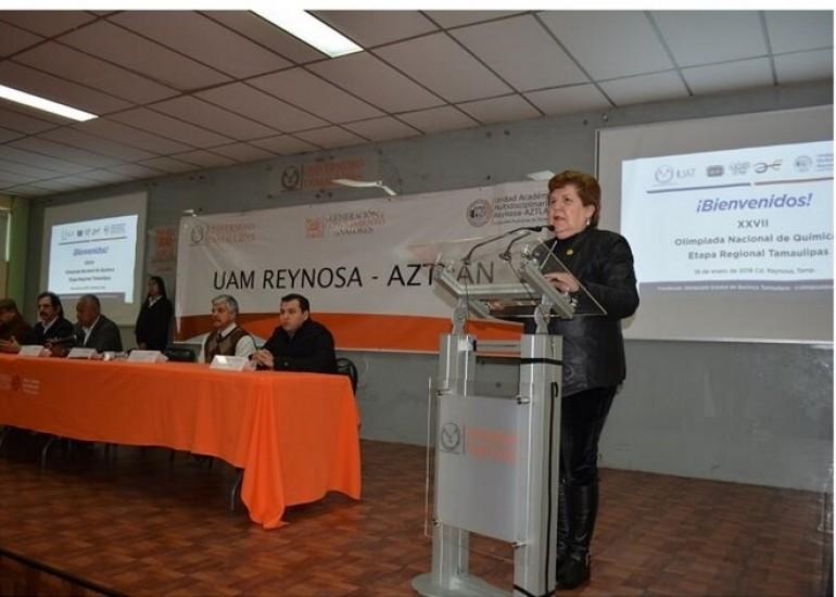 “Para nosotros es un orgullo que en este campus Reynosa-Aztlán perteneciente a la Universidad Autónoma de Tamaulipas, en compañía de nuestros colegas podamos recibir a los estudiantes de Nivel Medio Superior que asisten a la etapa estatal de la Vigésima Séptima Olimpiada Nacional de la Química”, dijo la Directora.