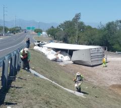 Guardia Estatal atiende volcadura de tractocamión en Ciudad Victoria.