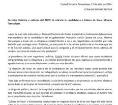 Decisión histórica y valiente del TEPJF al retirarle la candidatura a Cabeza de Vaca: Morena Tamaulipas