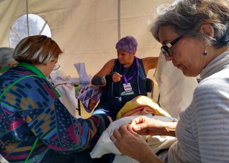 Tras un ritual de activación y un breve pronunciamiento por parte de Bernstorff, las asistentes pusieron manos a la obra para unir, con hilo y aguja, cientos de retazos de tela que, en lo individual, llevan experiencias personales de mujeres que luchan contra, o han sido víctimas de la violencia de género, y que en conjunto, llevan un mensaje colectivo importante: “el arte tiene la capacidad de sanar a la gente”.