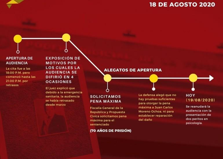 De acuerdo al comunicado emitido por la organización Propuesta Cívica este 21 de agosto de 2020, que el Juez Federal Nelsson Pedraza Sotelo dictó condena por el reprochable crimen: 50 años de prisión., señalando que el 18 de marzo de este año, fue dictado fallo condenatorio en contra de Juan Carlos Moreno Ochoa “Larry” por su participación en el asesinato de la periodista, pero debido a la pandemia por Covid-19 se retrasó la sentencia judicial.