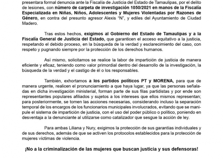 Tras estos hechos, exigimos al Gobierno del Estado de Tamaulipas y a la Fiscalía General de Justicia del Estado, que garanticen el acceso equitativo a la justicia, respetando el debido proceso, en la búsqueda de la verdad y esclarecimiento del caso, con respeto y pugnando siempre por la protección de los derechos humanos.